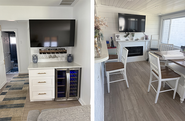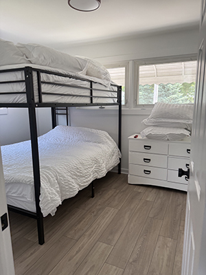 - 2 Bedrooms – Master bedroom one queen / 2nd bedroom queen bunk beds / Living room chairs and sofa are pullout beds that turn into a full and two twins.